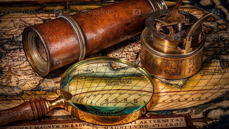 Фон концепции навигации по географии путешествий - панорама старого винтажного ретро-компаса с солнечными часами, подзорной трубой и веревкой на карте древнего мира