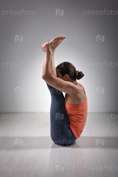 Спортивная женщина практикует асану йоги Урдхва мукха пашчимоттанасана - интенсивное растяжение лицом вверх