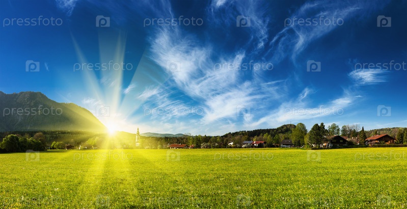 Панорама немецкой сельской местности и деревни на закате с солнцем. Бавария, Германия