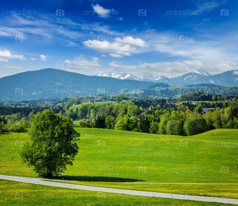 Дорога в пасторальной идиллической немецкой сельской местности на фоне Баварских Альп в прекрасный летний день