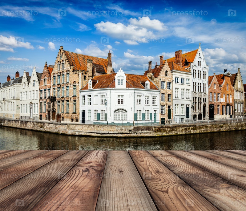 Деревянные доски с европейским видом на канал Брюгге и старые исторические дома средневековой архитектуры на заднем плане. Брюгге, Бельгия