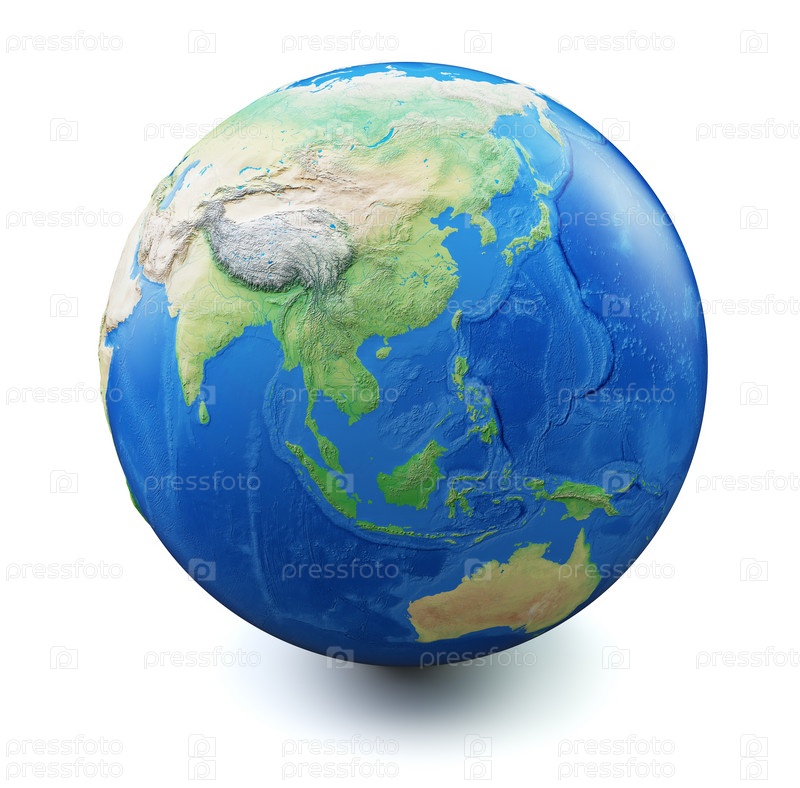 Земля изолирована на белом фоне с мягкой тенью. Фокус на Китай, Юго-Восточную Азию, Австралию, Океанию. Используемые карты и земные данные созданы на компьютере и находятся в свободном доступе