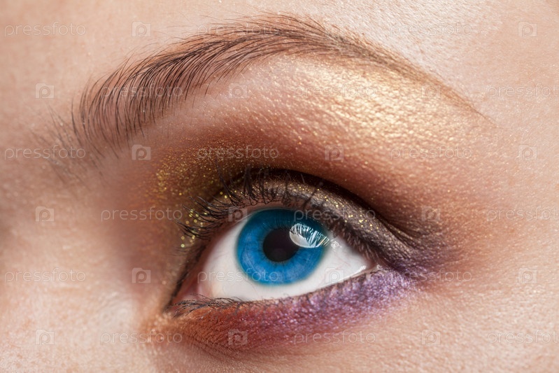 Макроизображение голубого человеческого глаза женщины с макияжем