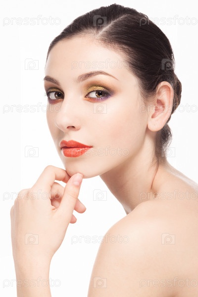 Красота модной девушки. Портрет красивой молодой женщины со свежей чистой кожей, изолированной на белом фоне