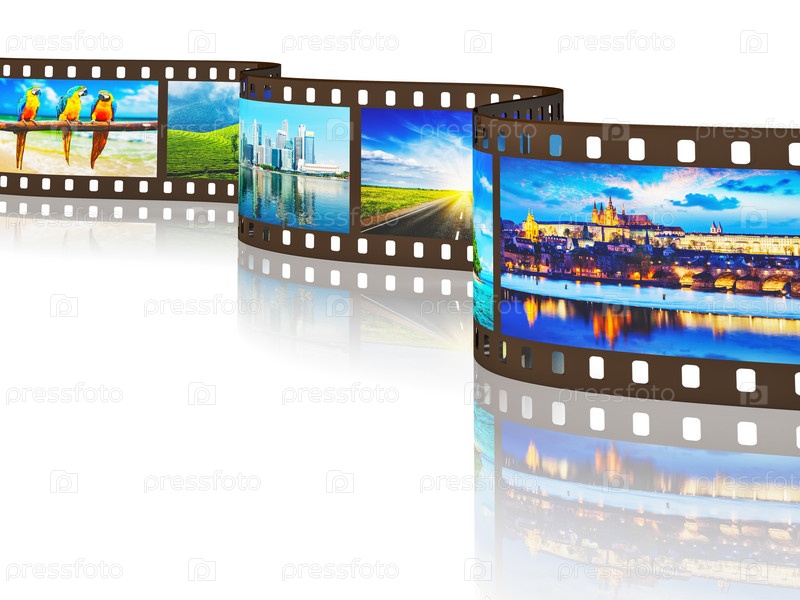 Концепция глобальных путешествий по странам мира - фотопленка с изображениями путешествий с отражением на белом фоне