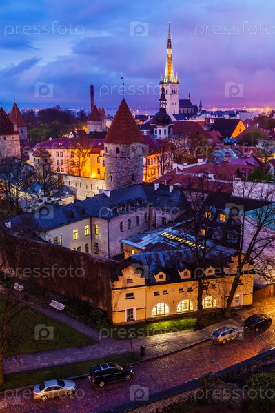 Вид с воздуха на средневековый Старый город Таллина, освещенный вечером, Эстония