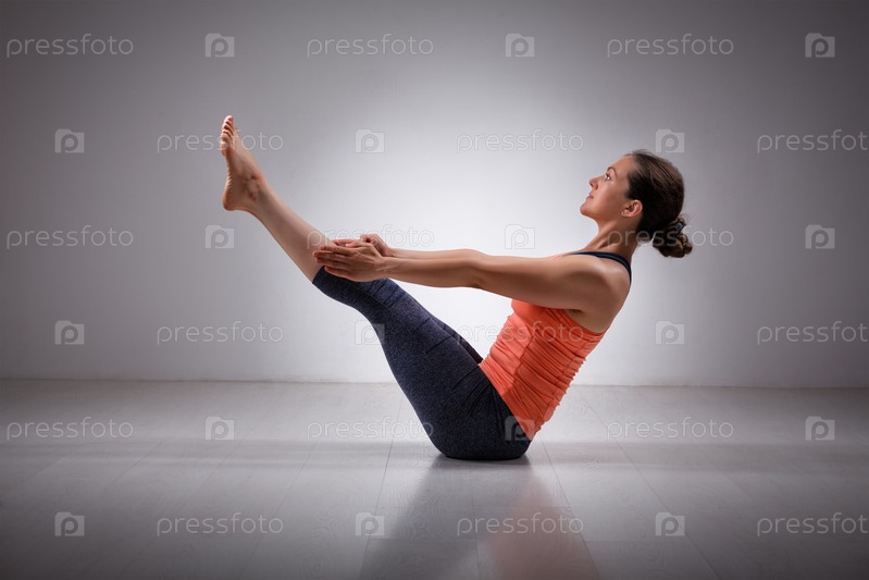 Женщина практикует асаны йоги. Пленарная навасана