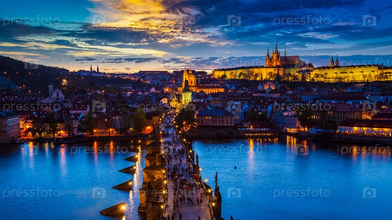 Панорама освещенного Пражского Града и Карлова моста с туристической толпой над рекой Влтавой в Праге, Чехия. Прага, Чехия вечером