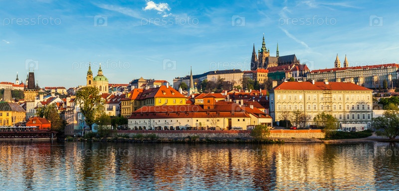 Панорама Градчан (Пражский Град) и собора Святого Вита над рекой Влтавой на закате