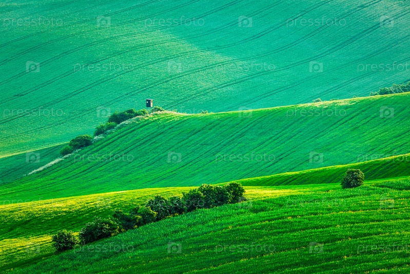 Моравский холмистый пейзаж с хижиной охотничьей башни на закате. Моравия, Чехия