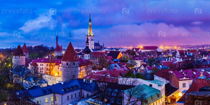 Панорама с воздуха на средневековый Старый город Таллина с церковью Святого Олафа и городской стеной Таллинна, освещенной в сумерках, Эстония