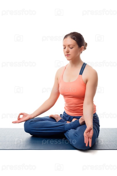 Красивая женщина-йогиня, медитирующая в асане йоги Падмасана (поза Лотоса) со скрещенными ногами для медитации с Чин Мудрой - психический жест сознания, изолированный на белом фоне