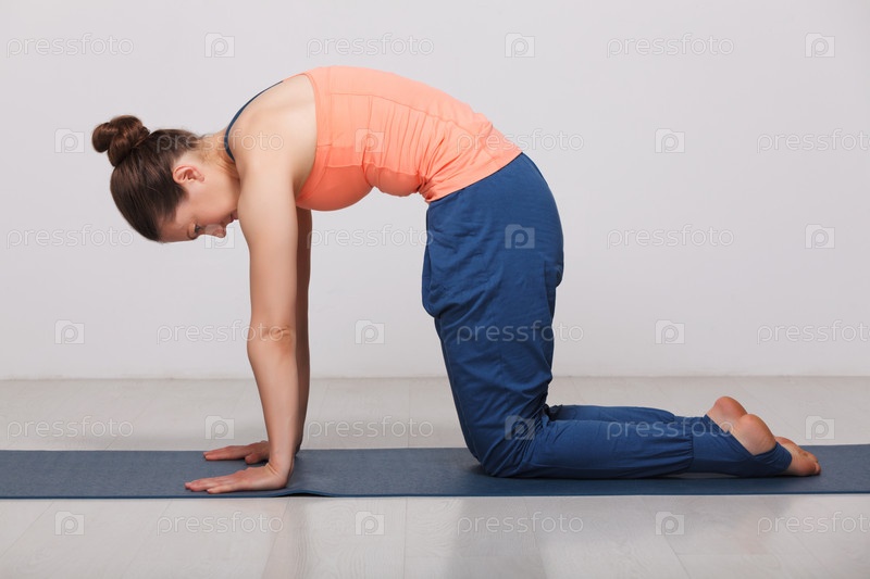 Красивая спортивная женщина-йогиня практикует йогу асану марджариасана - поза кошки, нежная разминка позвоночника (также называемая позой кошки-коровы) в студии