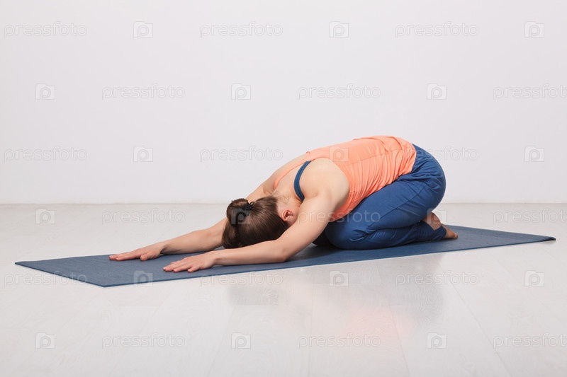 Красивая спортивная женщина-йогиня занимается йогой асана баласана (поза ребенка) - поза отдыха или контрасана для многих асан в студии