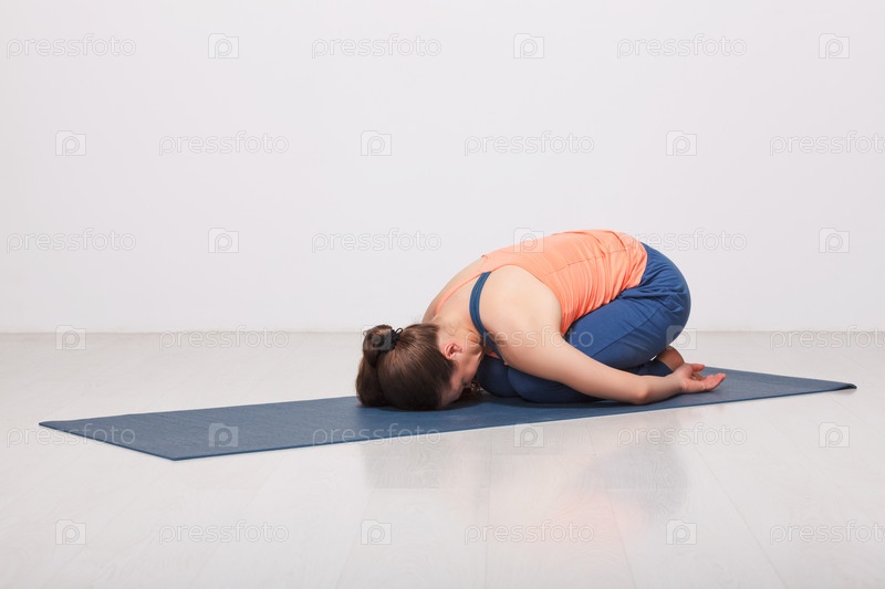 Красивая спортивная женщина-йогиня занимается йогой асана баласана (поза ребенка) - поза отдыха или контрасана для многих асан в студии