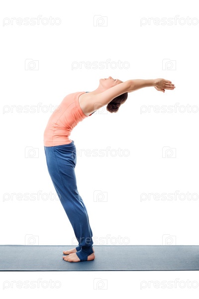 Красивая спортивная женщина занимается йогой Шиванамда асана Анувиттасана - поза согнутой спины, изолированная на белом