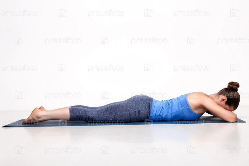 Спортивная женщина расслабляется в асане йоги Макарасане