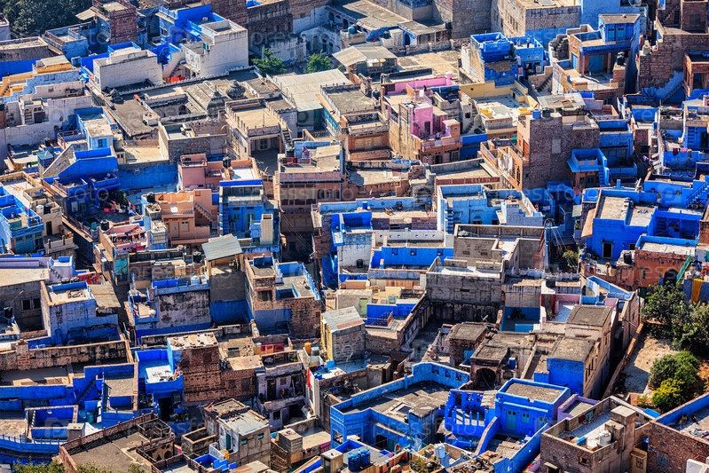 Вид с воздуха на Джодхпур, также известный как Голубой город из-за ярко выкрашенных в синий цвет домов браминов вокруг форта Мехрангарх. Джодпур, Раджастан