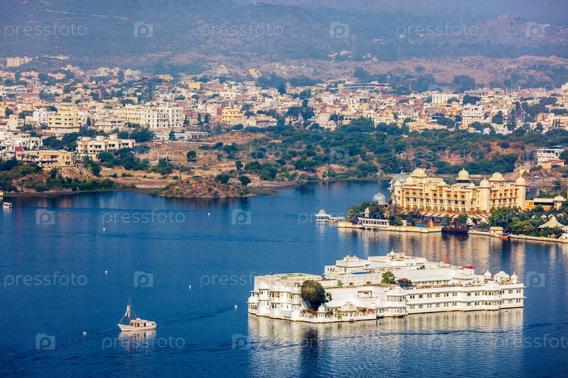 Вид с воздуха на озеро Пичола с Озерным дворцом (Джаг Нивас). Удайпур, Раджастхан, Индия