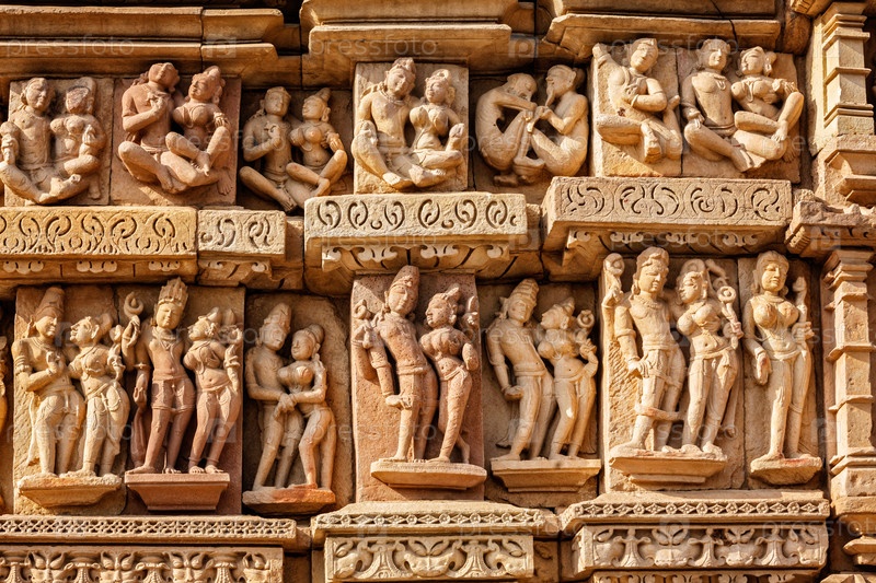 Каменные барельефные скульптуры на храме Адинатх Джайн, известном индийском туристическом объекте Кхаджурахо, Мадхья-Прадеш, Индия