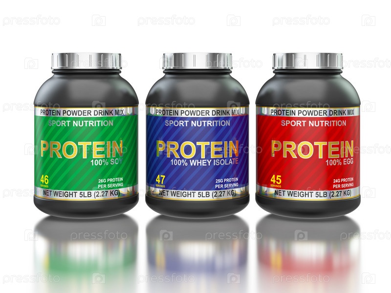 Спортивное питание, добавки для бодибилдинга, концепция спортивной диеты - банки с изолятом сыворотки, соевым и яичным белком в очереди, изолированные на белом фоне с отражением