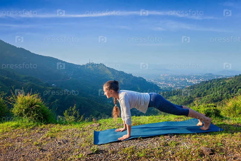 Женщина занимается хатха-йогой асанами в позе доски на открытом воздухе