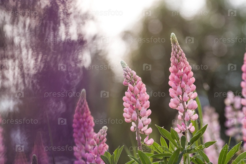 Цветение полевых крупнолистных люпин или садовых люпинов в начале лета, большой план с выборочным фокусом