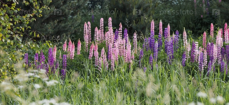 Цветение полевых крупнолистных люпин или садовых люпинов в начале лета, большой план с выборочным фокусом