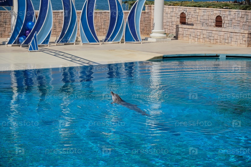 Дельфин плавает в кристально чистых голубых водах дельфинария. Отдых на базе отдыха недалеко от побережья Черного моря. Турция