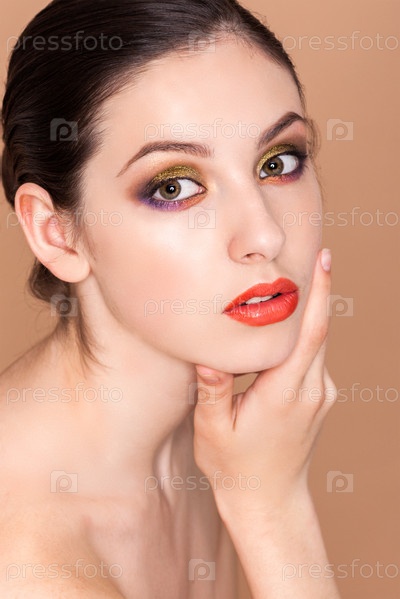 Красота модной девушки. Портрет красивой молодой женщины со свежей чистой кожей на бежевом фоне