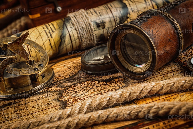 Старый винтажный компас на древней карте