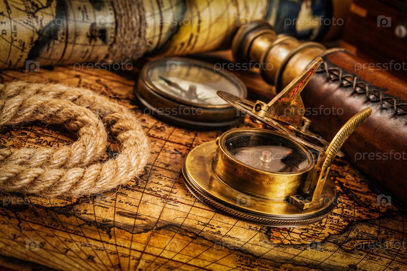 Фон концепции навигации по географии путешествий - старый винтажный ретро-компас с солнечными часами, подзорной трубой и веревкой на карте древнего мира
