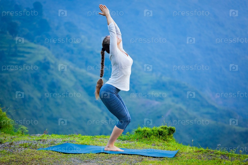 Женщина занимается йогой асана Уткатасана на открытом воздухе