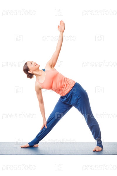 Спортивная женщина занимается йогой асана уттхита триконасана