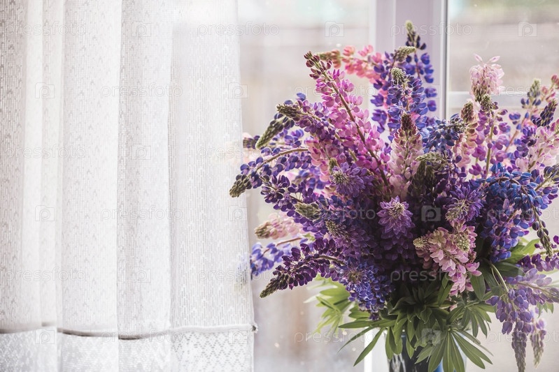 Букет цветущих люпинов в вазе (Lupinus polyphyllus) Цветение полевых крупнолистных или садовых люпин в начале лета, большой план с выборочным фокусом