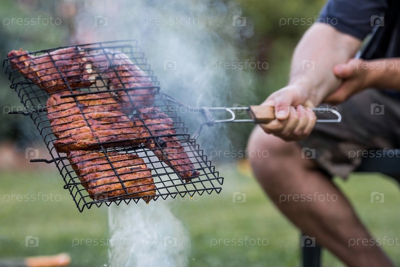 Барбекю на даче. Майские праздники. Барбекю на природе. Процесс приготовления мяса на гриле, крупный план. Шашлык из свиных ребрышек на мангале
