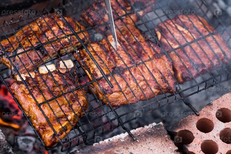 Барбекю на даче. Майские праздники. Барбекю на природе. Процесс приготовления мяса на гриле, крупный план. Шашлык из свиных ребрышек на гриле