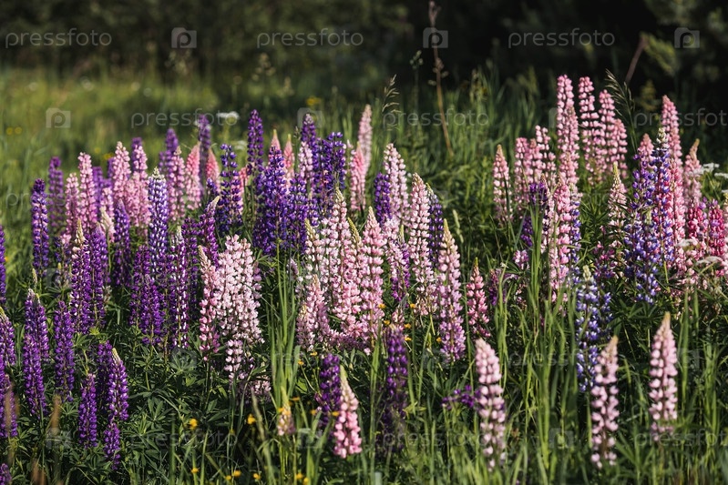 Цветение полевых крупнолистных люпин или садовых люпинов в начале лета, большой план с выборочным фокусом