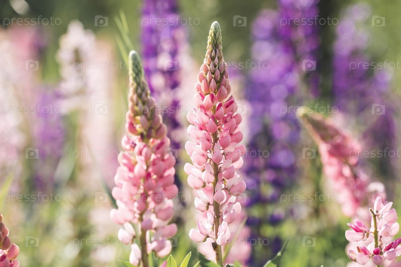 Цветение полевых крупнолистных люпин или садовых люпинов в начале лета, большой план с выборочным фокусом