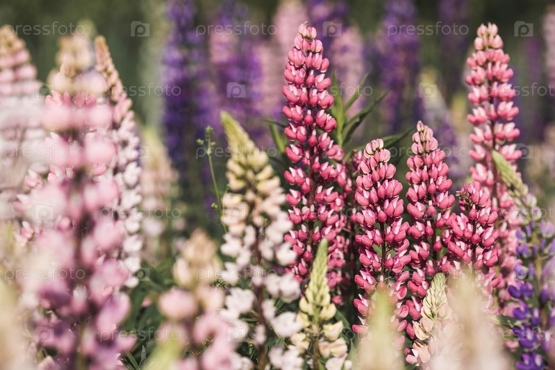 Цветение полевых крупнолистных люпин или садовых люпинов в начале лета, большой план с выборочным фокусом