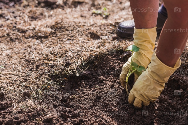 Руки пожилой женщины держат молодое растение в земле. Саженцы тыквы высаживают в грунт. Крупный план. Концепция весенней посадки овощей и сельского хозяйства