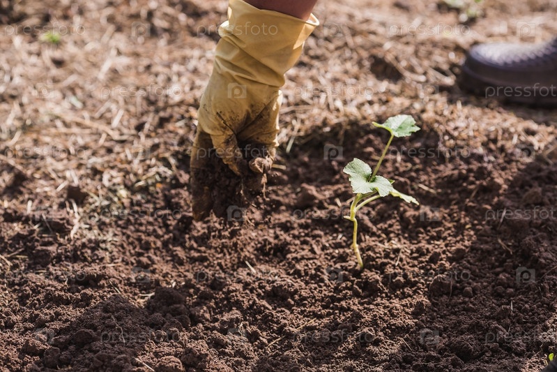 Руки пожилой женщины держат молодое растение в земле. Саженцы тыквы высаживают в грунт. Крупный план. Концепция весенней посадки овощей и сельского хозяйства