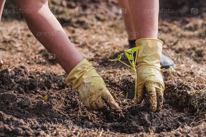 Руки пожилой женщины держат молодое растение в земле. Саженцы тыквы высаживают в грунт. Крупный план. Концепция весенней посадки овощей и сельского хозяйства