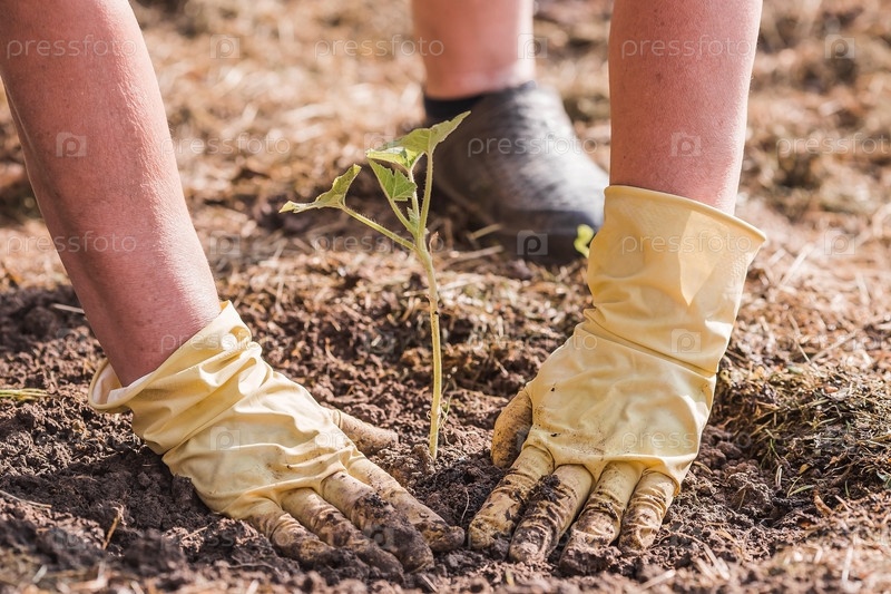 Руки пожилой женщины держат молодое растение в земле. Саженцы тыквы высаживают в грунт. Крупный план. Концепция весенней посадки овощей и сельского хозяйства