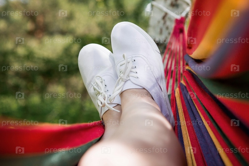 Кемпинг на природе. Женские ноги в белых кроссовках на гамаке в летнем саду. Концепция беззаботного летнего отдыха