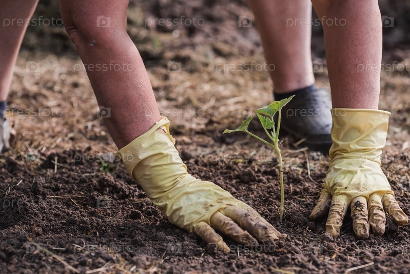Руки пожилой женщины держат молодое растение в земле. Саженцы тыквы высаживают в грунт. Крупный план. Концепция весенней посадки овощей и сельского хозяйства