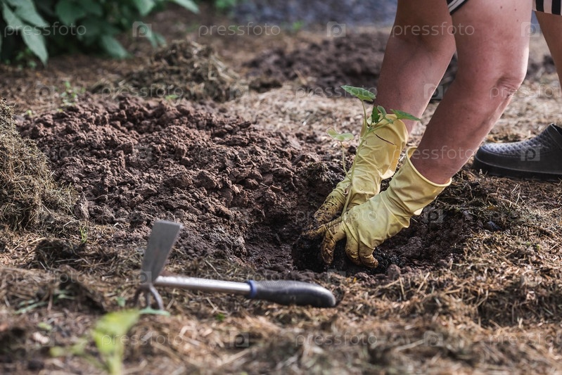 Руки пожилой женщины держат молодое растение в земле. Саженцы тыквы высаживают в грунт. Крупный план. Концепция весенней посадки овощей и сельского хозяйства