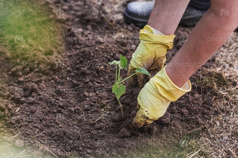 Руки пожилой женщины держат молодое растение в земле. Саженцы тыквы высаживают в грунт. Крупный план. Концепция весенней посадки овощей и сельского хозяйства