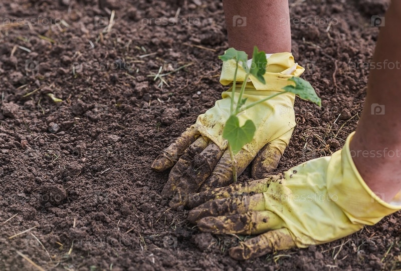 Руки пожилой женщины держат молодое растение в земле. Саженцы тыквы высаживают в грунт. Крупный план. Концепция весенней посадки овощей и сельского хозяйства