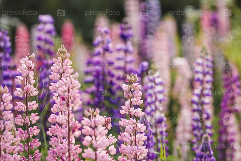 Цветение полевых крупнолистных люпин или садовых люпинов в начале лета, большой план с выборочным фокусом